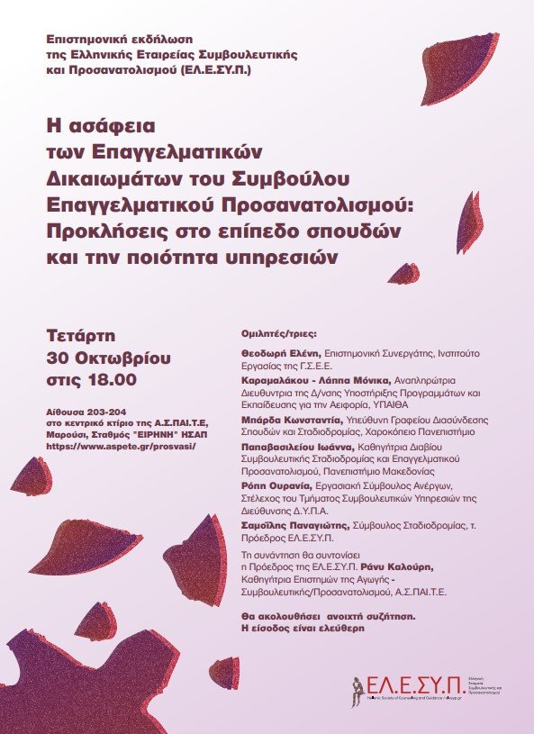 Το Δ.Σ. της ΕΛ.Ε.ΣΥ.Π. προσκαλεί τους Συμβούλους  Επαγγελματικού Προσανατολισμού/Σταδιοδρομίας, Εκπαιδευτικούς, Φοιτητές στη Συμβουλευτική και τον Επαγγελματικό Προσανατολισμό (ΣυΕΠ), καθώς επίσης και κάθε ενδιαφερόμενο σε επιστημονική εκδήλωση, την Τετάρτη 30/10/2024 και ώρα 18.00 στην ΑΣΠΑΙΤΕ, με θέμα: